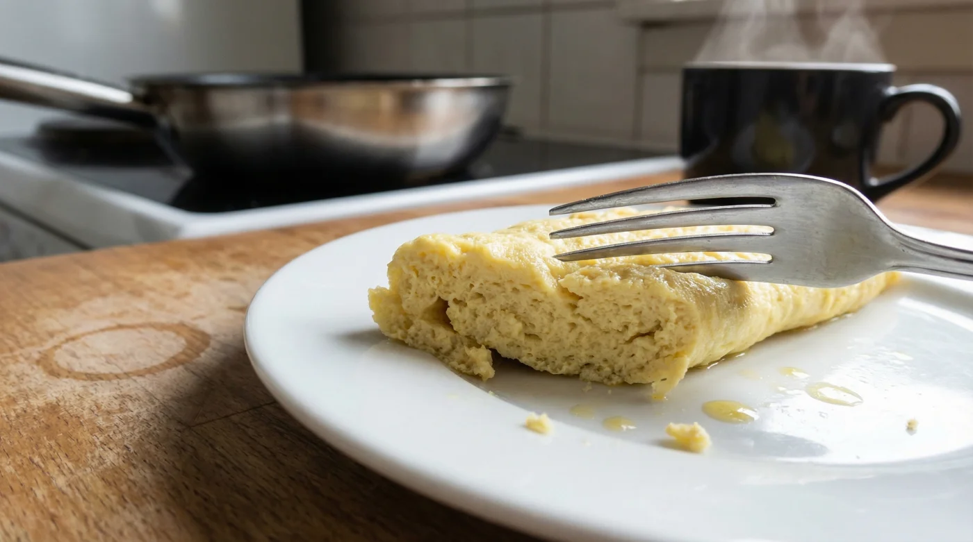När du introducerar mjölkproteiner och det extra fettet från mejeriet, tvingar du äggen att jobba övertid. Resultatet blir att proteinsträngarna drar ihop sig för hårt. De klamrar sig fast vid varandra i panik och pressar ut fukten. Din omelett andas genom en kudde, kvävd av den tunga mjölken. Den luftiga spänst du letar efter ersätts av en kompakt och tråkig massa.