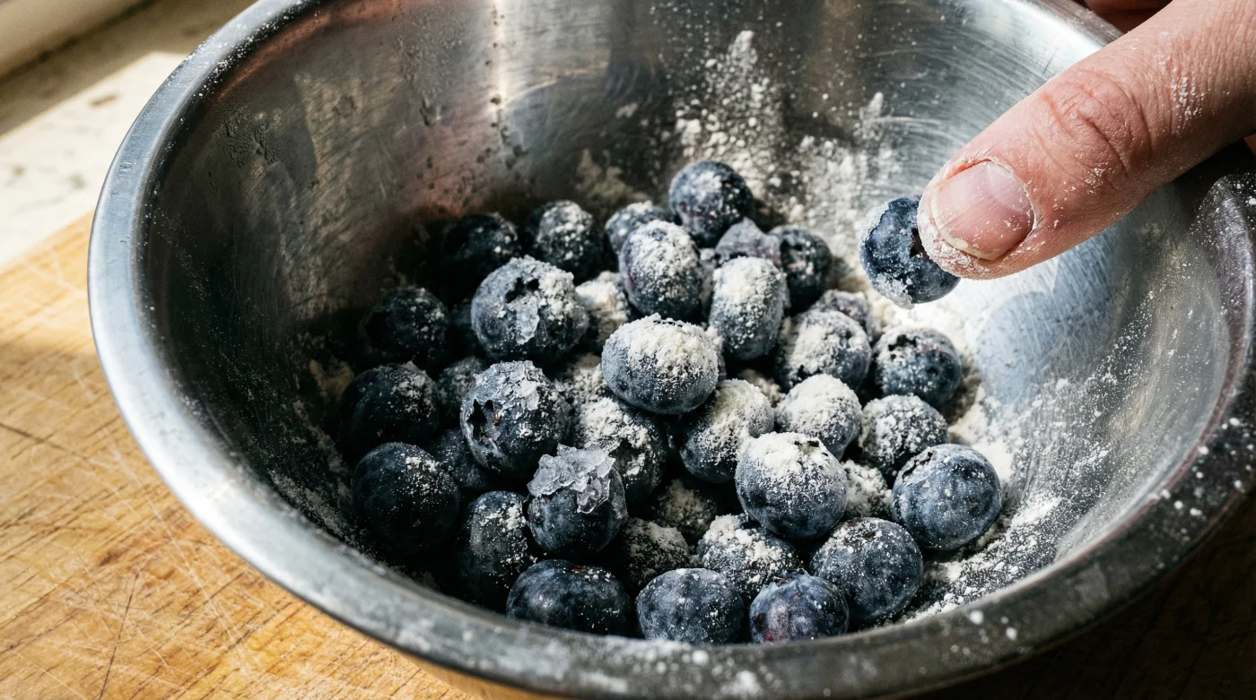 Lösningen på detta utbredda problem är emellertid lika genial som den är anspråkslös. Det handlar om en enda, enkel matsked vetemjöl. Genom att vända dina frysta blåbär i lite mjöl innan de ens kommer i närheten av smeten, skapar du en livsviktig skyddande sköld. Mjölet kapslar in den blödande saften i samma sekund som bäret börjar tina i ugnen. Dessutom skapar denna tunna mjölkappa en textur på bärets yta som griper tag i smetens nätverk. Det fungerar bokstavligen som en liten flytväst som håller bären jämnt svävande i degen under hela gräddningen.