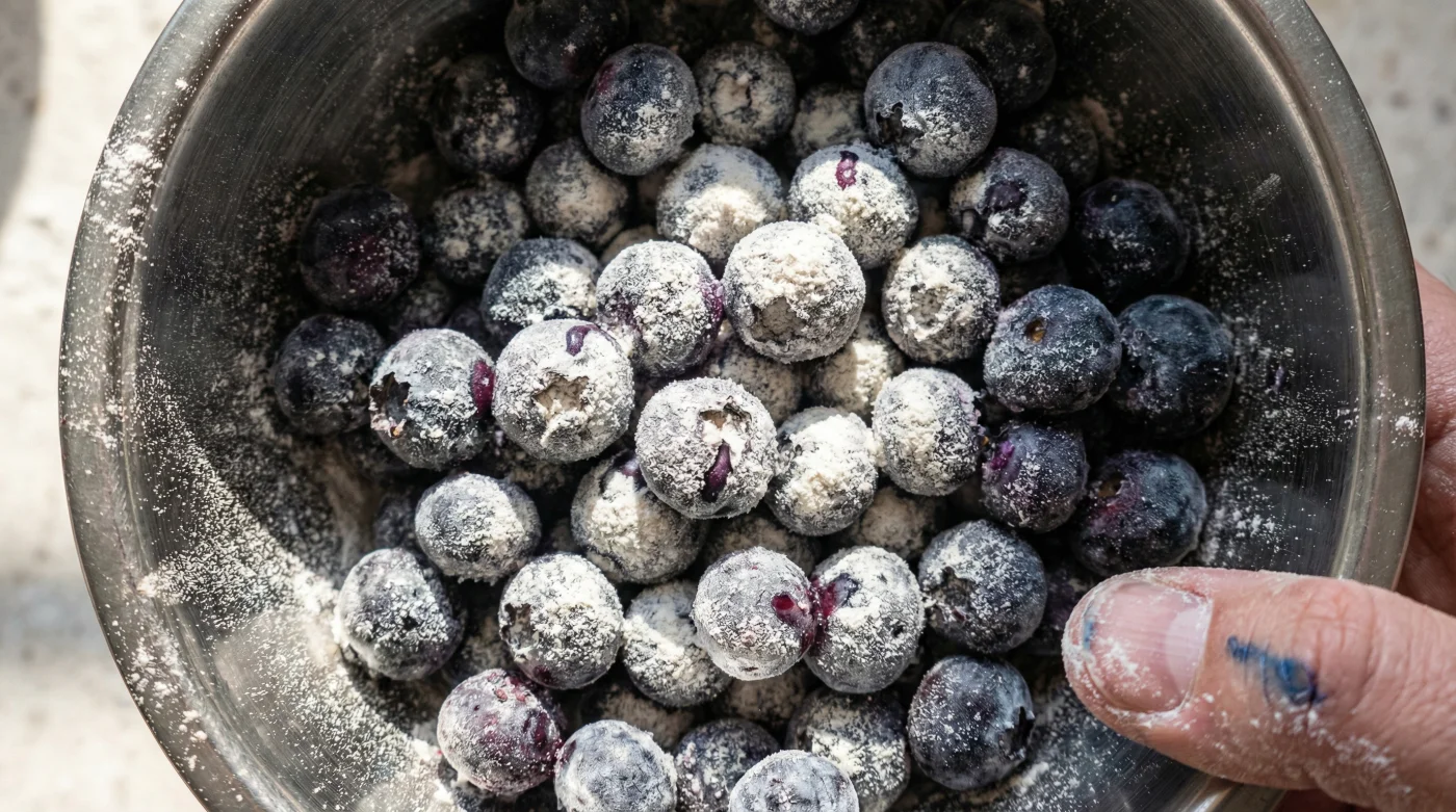 Lösningen på detta utbredda problem är emellertid lika genial som den är anspråkslös. Det handlar om en enda, enkel matsked vetemjöl. Genom att vända dina frysta blåbär i lite mjöl innan de ens kommer i närheten av smeten, skapar du en livsviktig skyddande sköld. Mjölet kapslar in den blödande saften i samma sekund som bäret börjar tina i ugnen. Dessutom skapar denna tunna mjölkappa en textur på bärets yta som griper tag i smetens nätverk. Det fungerar bokstavligen som en liten flytväst som håller bären jämnt svävande i degen under hela gräddningen.
