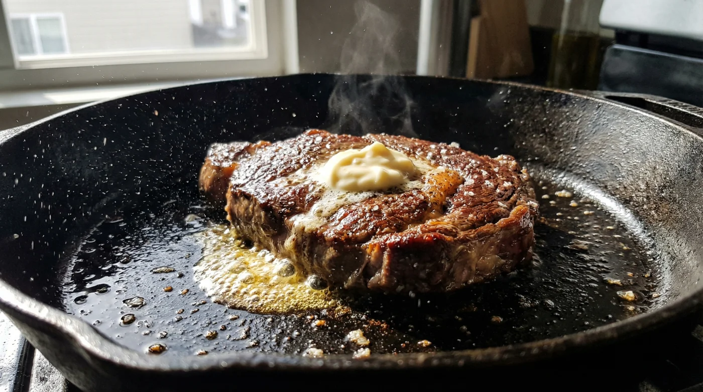 Värm din panna till medelhög värme. Du behöver inget matfett alls i pannan. Lägg ner köttet. Du kommer genast att märka skillnaden. Det fräser inte lika ilsket, det sprätter inte hett fett över hela spisen. Istället hör du ett dovt, tryggt och jämnt fräsande. När du efter ett par minuter lyfter på kanten kommer köttet att släppa helt frivilligt, och ytan kommer att vara djupt gyllenbrun och prasslande krispig.