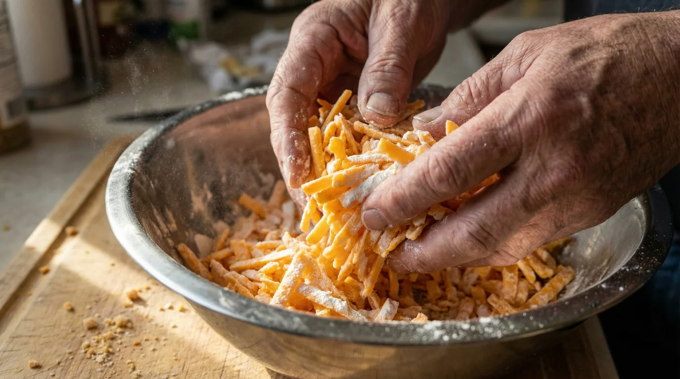 Vänd osten mycket försiktigt med händerna. Du strävar efter att varje enskild strimla ska få en tunn, nästan osynlig beläggning. Känn noga hur osten plötsligt känns lite torrare, lite strävare mellan fingrarna. Det är exakt den känslan du letar efter. Nu har du skapat en barriär som skyddar osten från dess egna värsta instinkter.