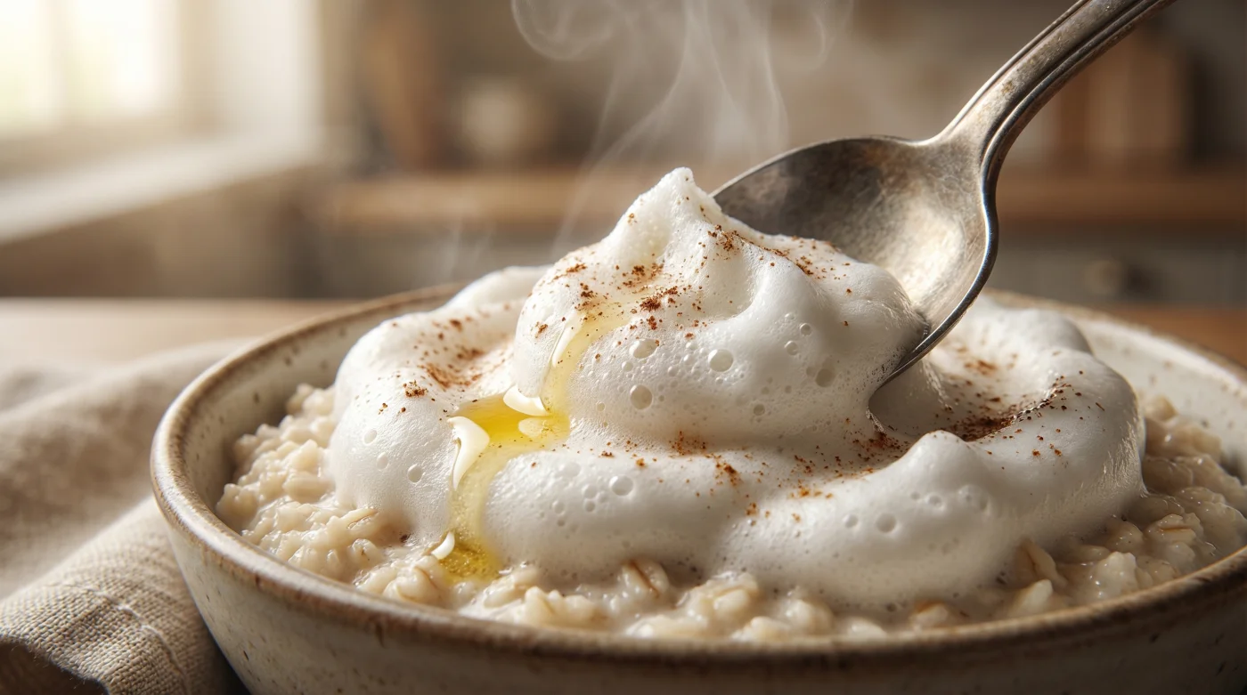 Föreställ dig att du staplar stenar till en mur. Havregrynen är dina tunga byggstenar, men i den traditionella gröten saknas det murbruk som kan skapa rymd och luft mellan lagren. Den uppvispade äggvitan agerar här som en osynlig, fjäderlätt byggnadsställning. Genom att mekaniskt arbeta in luft i proteinet med din handvisp, och sedan omedelbart låsa fast den luften med hjälp av värmen från gröten, bygger du upp volymen från botten innan stärkelsen drar ihop sig och kollapsar muren.
