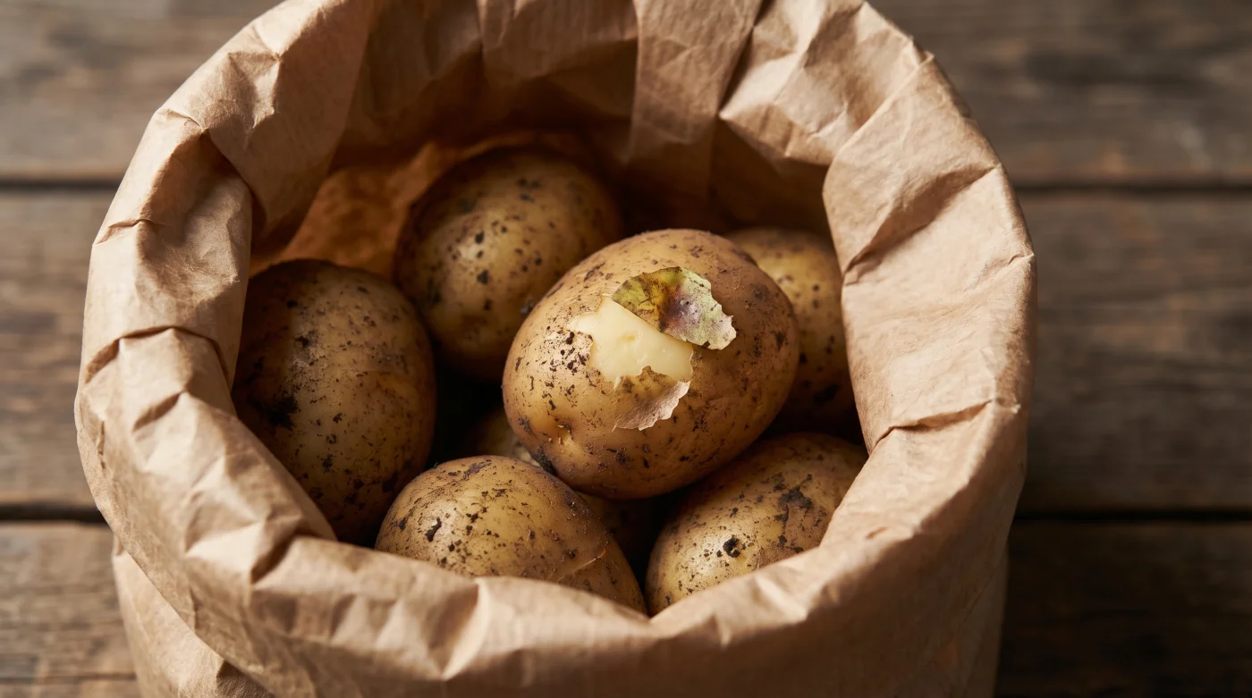 • Andningsförmåga: Använd uteslutande papperspåsar, tygkassar eller flätade korgar. Plast stänger in fukt och påskyndar mögelbildning.