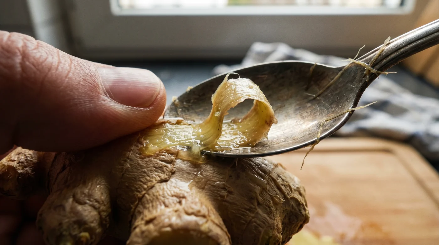 Om din morgonrutin bygger på att snabbt få ner hetta i varmt vatten, behöver du inte ens skala hela roten. Bryt av en liten knöl, skrapa snabbt med skeden och skiva den tunt. Skeden lämnar inga vassa kanter på den bit du sparar, vilket minskar risken för att snittytan torkar ut i kylskåpet.