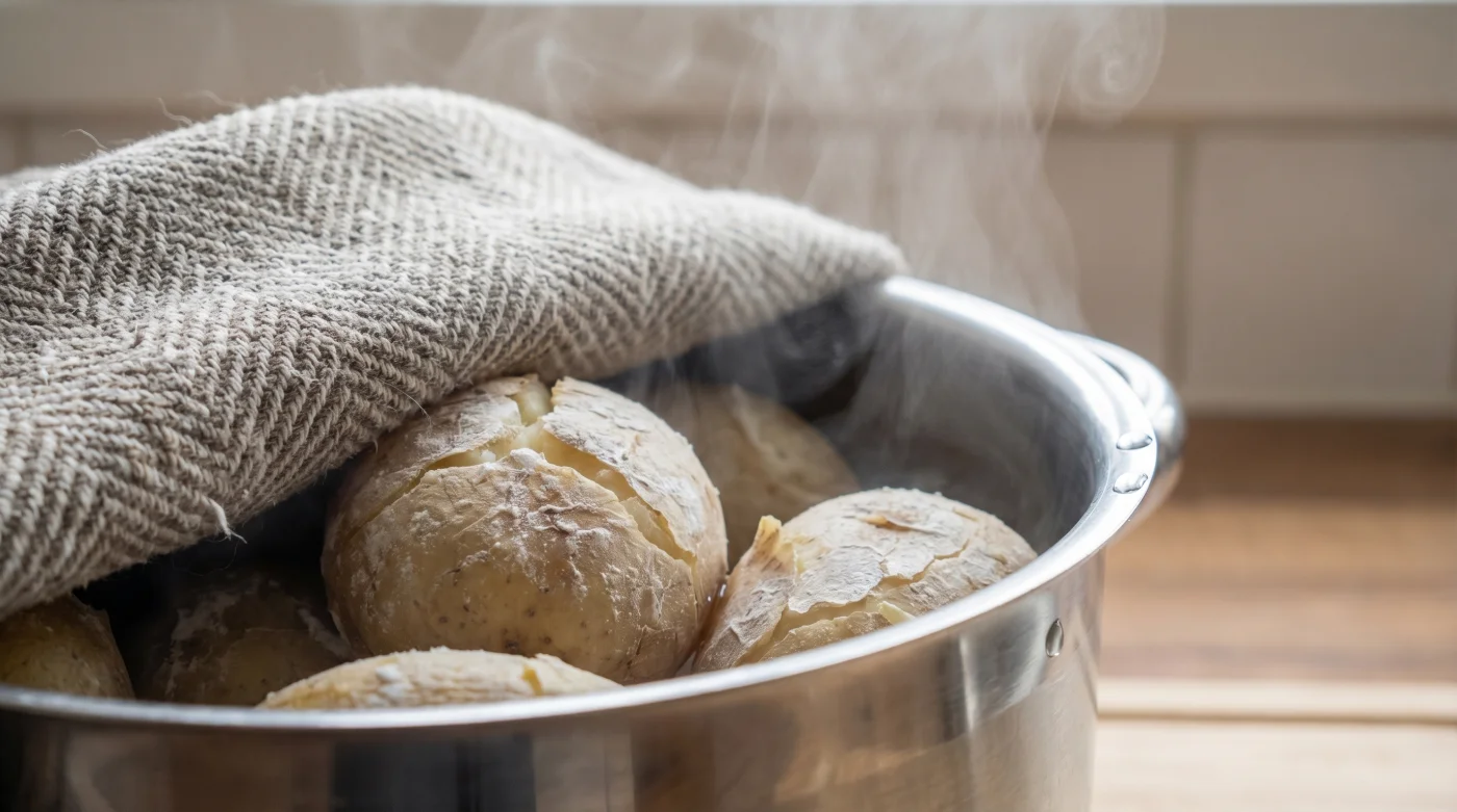 För den mjöliga puristen som älskar sorter som King Edward eller en delikat Mandelpotatis, måste man förstå att dessa redan bär på en extremt skör inre struktur. Här räcker det med tre till fyra minuters vila under handduken. Låter du dem ligga längre i det slutna värmerummet riskerar du att de spricker sönder helt av sin inre värme, så skörheten kräver mycket varsam hantering om du vill undvika ett oavsiktligt potatismos på skärbrädan.