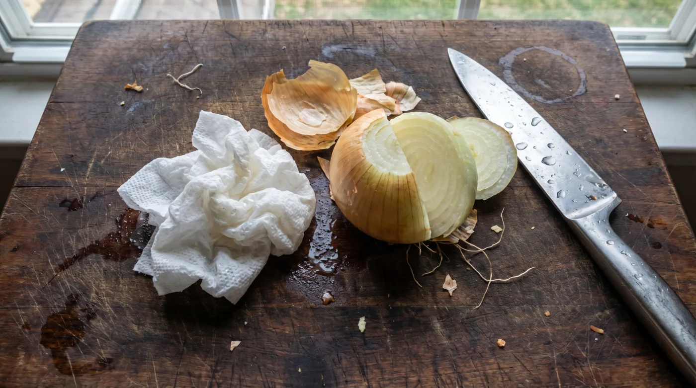 Kanske arbetar du i stället med små, intensiva schalottenlökar till en finstämd vitvinsås. Här är det inte mängden lök, utan närheten till ditt ansikte som är problemet, eftersom du naturligt lutar dig närmare för att få till de där mikroskopiska tärningarna. Vik ett litet fuktigt papper till en tight kvadrat och lägg det bokstavligen bara någon centimeter från löken. Denna placering skapar en omedelbar magnetisk barriär innan gasen ens hinner stiga upp mot dina ögon.