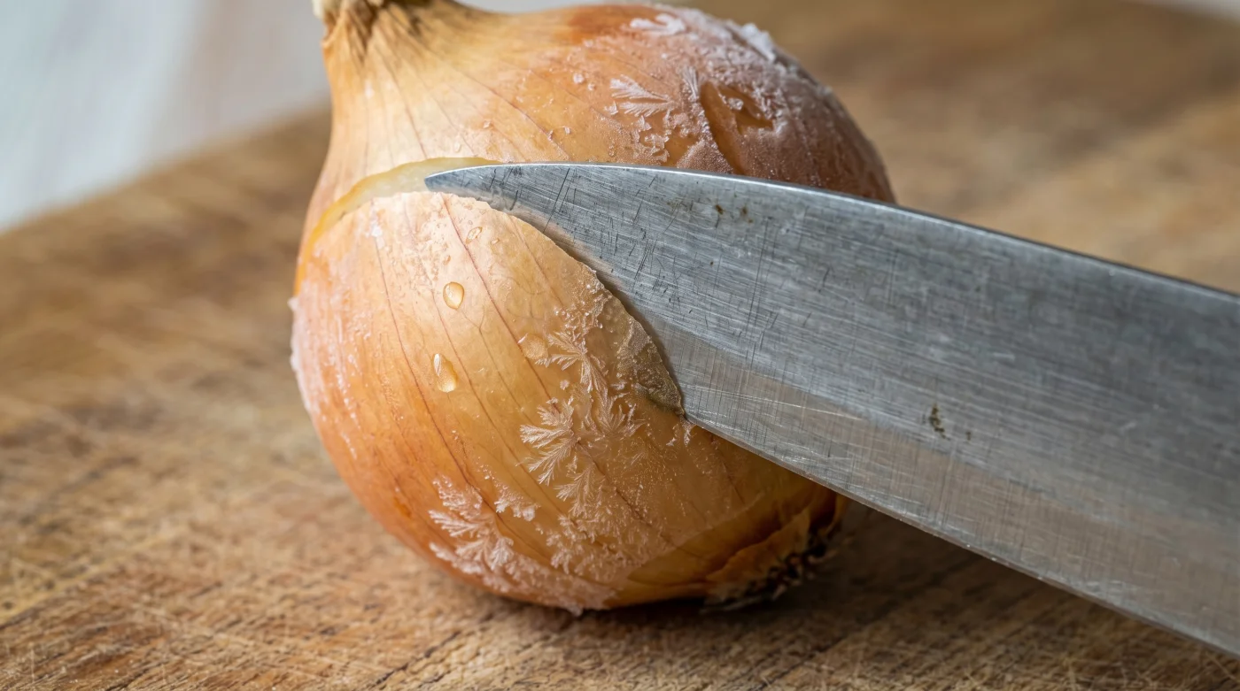 Den traditionella rekommendationen är att skära fortare, att försöka springa ifrån gasen genom ren snabbhet. Men om du istället lägger löken i frysen en kort stund innan kniven rör vid den, drar du i handbromsen på gasens fysik. Den skarpa kylan saktar ner den kemiska reaktionen och gör att svavelföreningarna blir kalla, tröga och tunga.