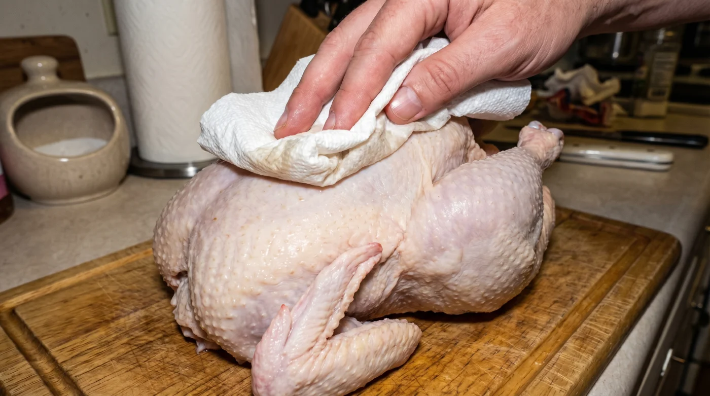 Skinnet kommer att se nästan genomskinligt och stramt läderartat ut morgonen därpå. Det är exakt den texturen du vill uppnå. Hushållspappret blir då bara en sista, betryggande säkerhetsåtgärd innan fågeln åker in i ugnsvärmen.