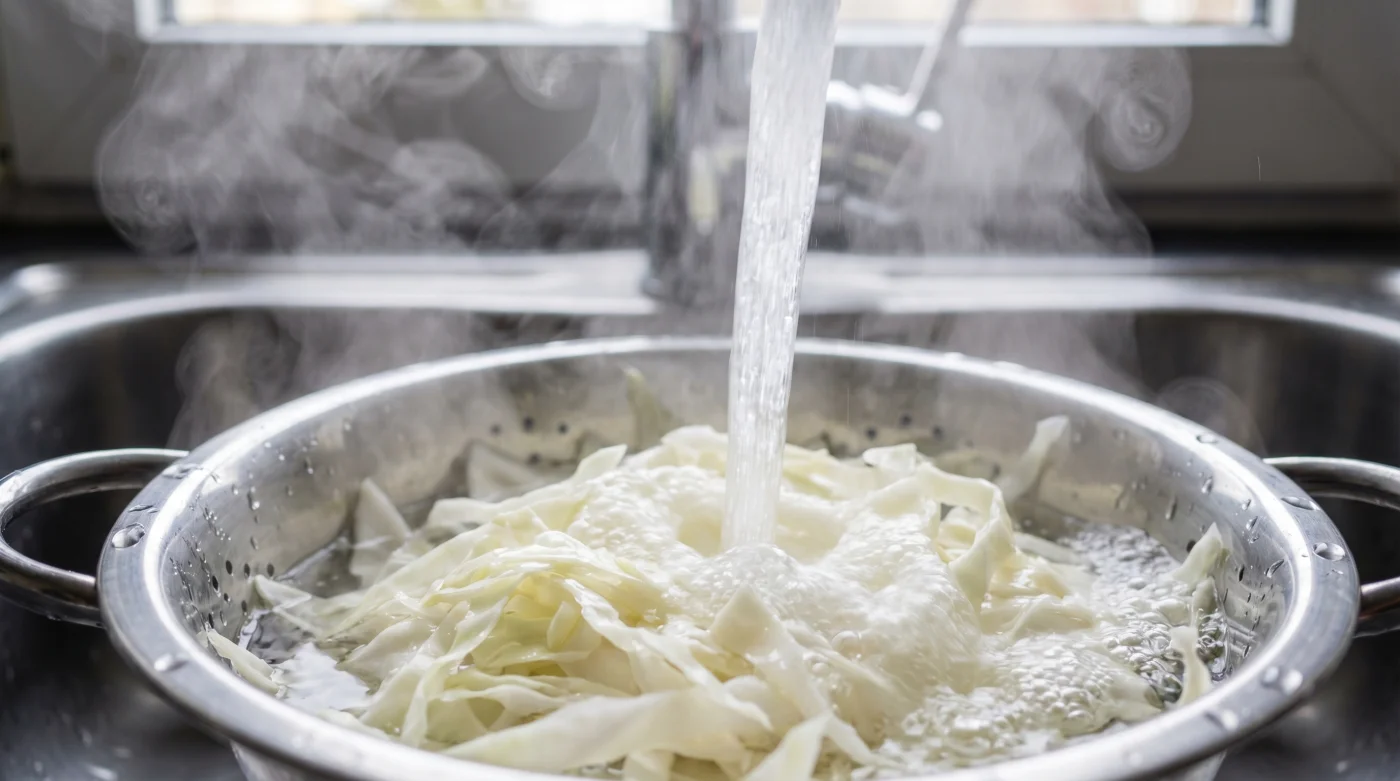 Här sker det verkliga skiftet. Genom att byta ut tidsödande mekanisk kraft mot en omedelbar termisk chock, får du kålens styva cellväggar att omedelbart ge upp. Det kokande vattnet fungerar som en mjuk men bestämd tillsägelse; det tvingar fibrerna att slappna av och kapitulera. Istället för att stöta bort marinaden som en tät regnjacka, förvandlas kålen till en porös tvättsvamp, redo att suga åt sig varenda droppe av syra och krydda i samma sekund som dressingen nuddar bladen.
