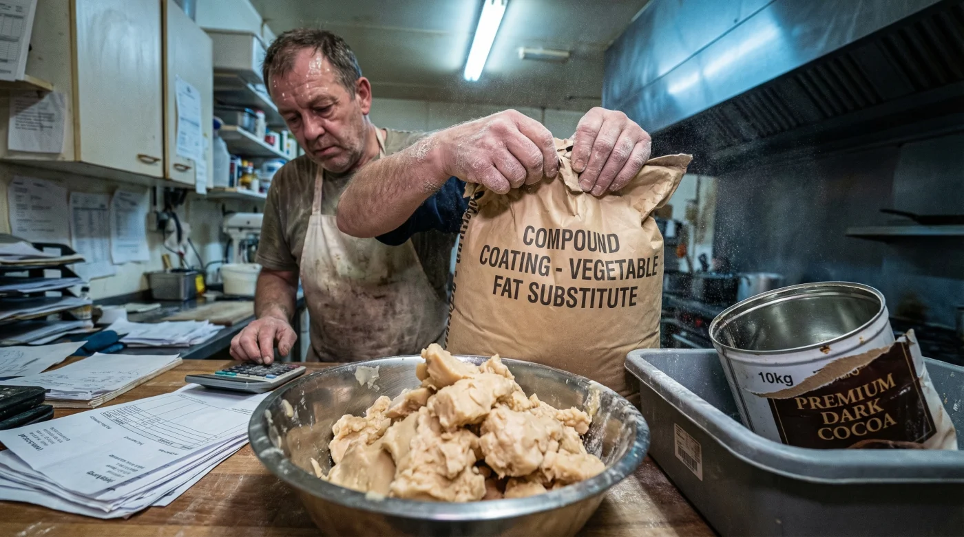 Compoundchoklad kringgår detta faktum helt. Genom att byta ut det dyra och svårarbetade kakaosmöret mot billigare fetter som hydrogenerad palmkärnolja, kokosfett eller sheanötsolja, elimineras behovet av temperering från ekvationen. Bagaren kan helt enkelt snabbt smälta massan i mikrovågsugnen och doppa sina biskvier, vilket sparar enormt mycket både i tid och pengar. Baksidan är emellertid att dessa vegetabiliska fetter har en helt annan molekylär struktur och smältpunkt än människans naturliga kroppstemperatur.