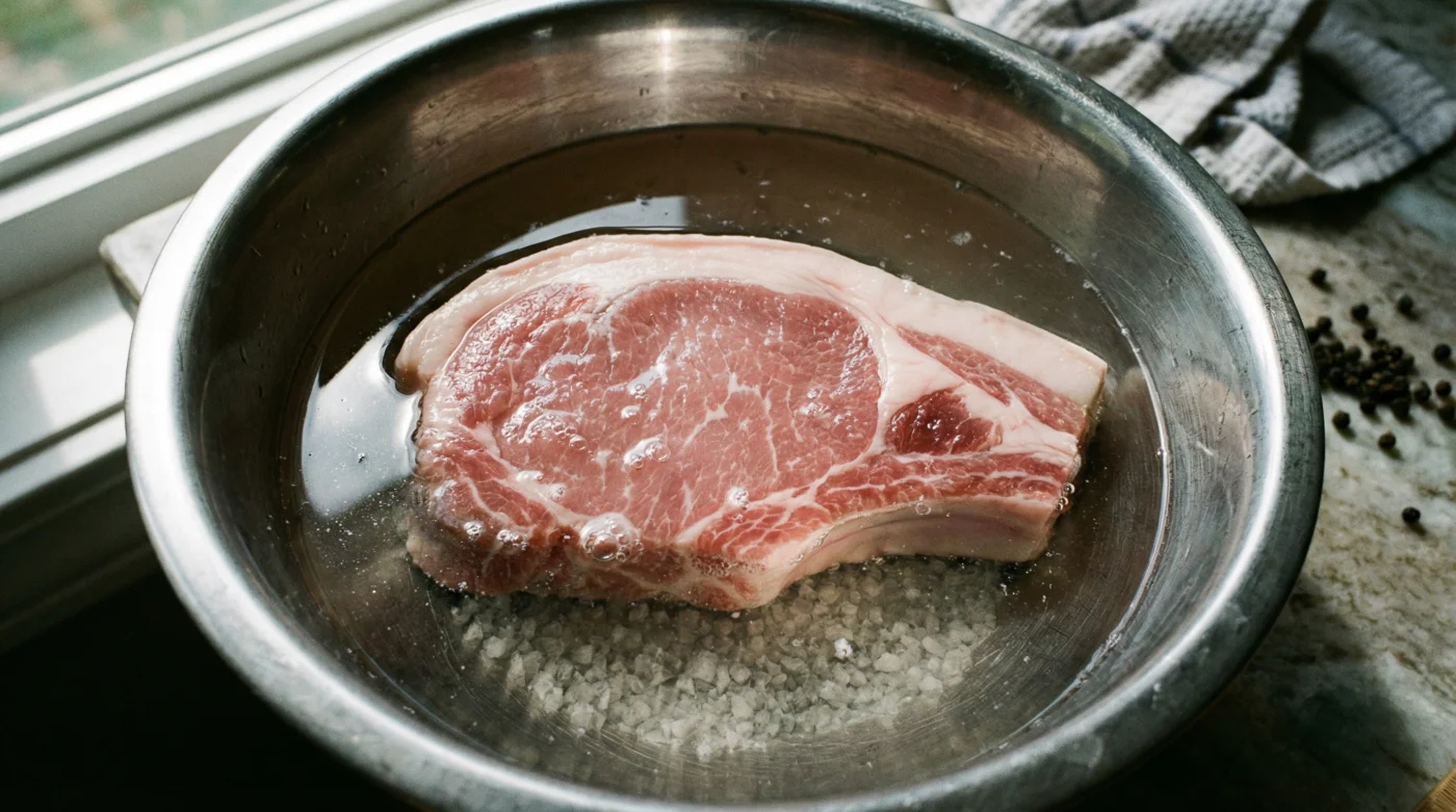 För vanliga fläskkotletter räcker 30 minuter perfekt. Låter du dem ligga över en timme riskerar du att de blir alldeles för salta och får en svampig textur.Måste jag använda varmt eller kallt vatten?