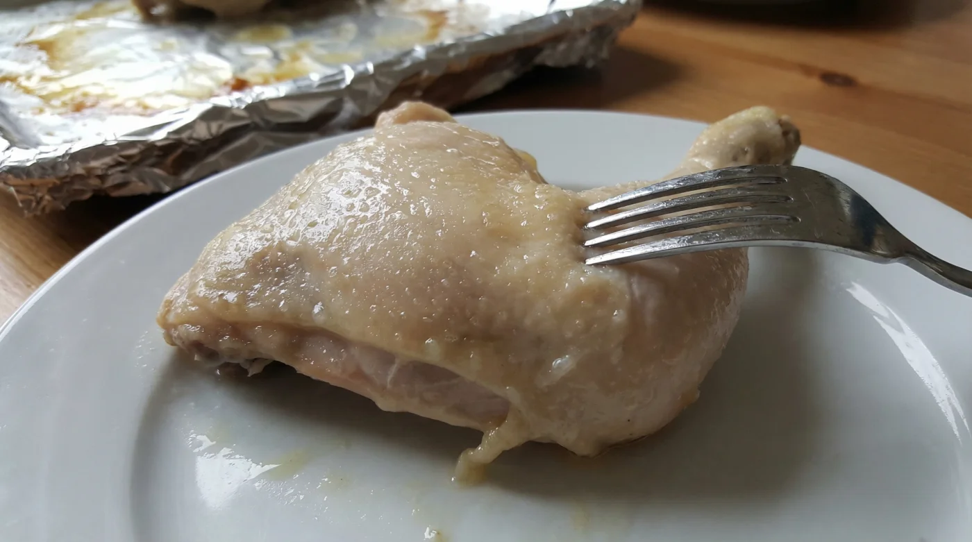 Det han menade var att lårköttet skiljer sig markant från det magra bröstköttet. Runt lårbenet finns ett fantastiskt nätverk av bindväv och fett. När temperaturen stiger smälter detta sakta ner och smörjer muskeltrådarna inifrån. Den mörka muskeln tål värme exceptionellt väl. Fettreserven betyder att maten skyddar sig själv, förutsatt att du låter utsidan sköta sitt jobb.