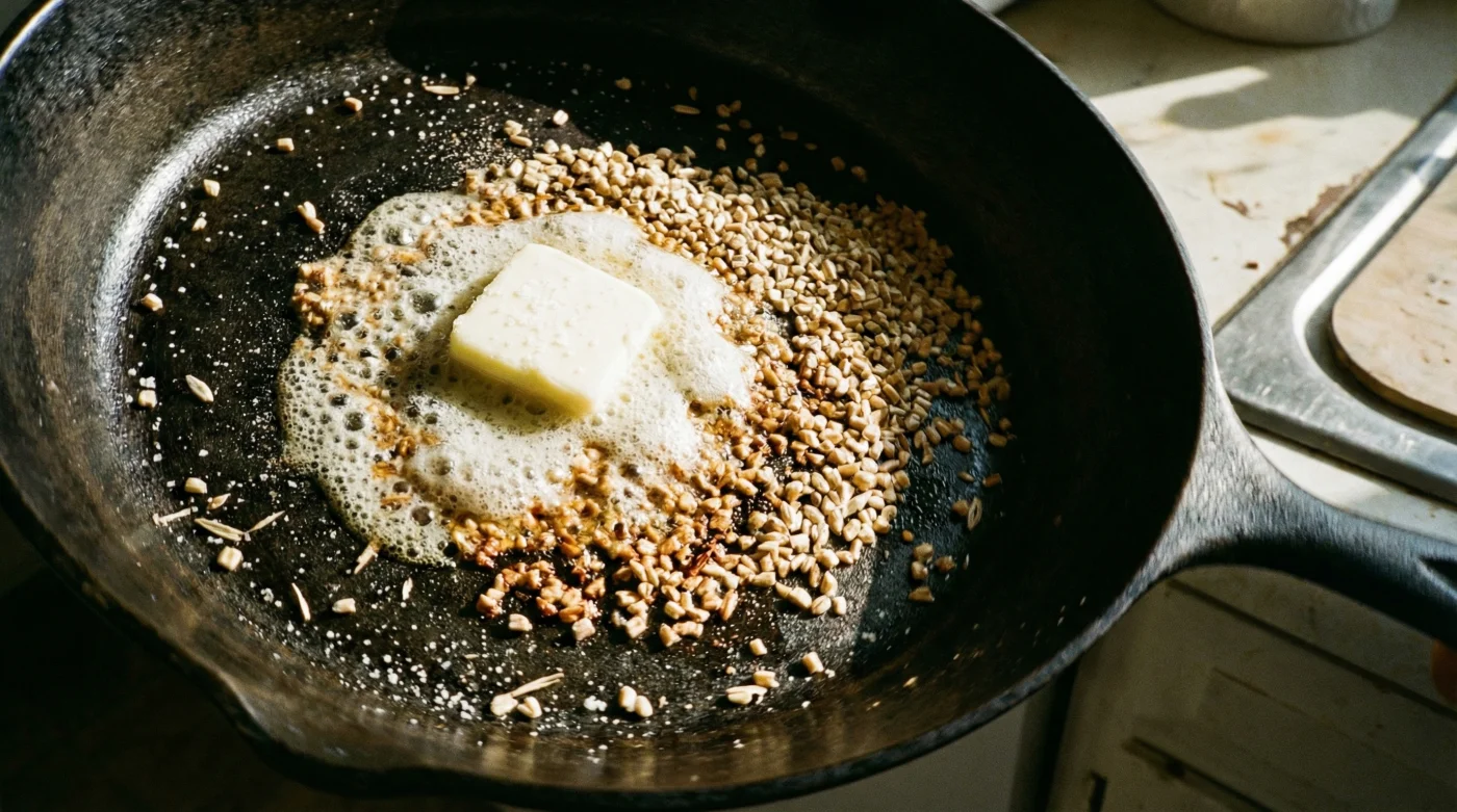 | Värmekontroll | Medelhög, tålmodig värme där grynen rostas jämnt utan stress. | Högsta värmen på spisen; bränt smör ger en bitter och oaptitlig underton åt hela frukosten. |