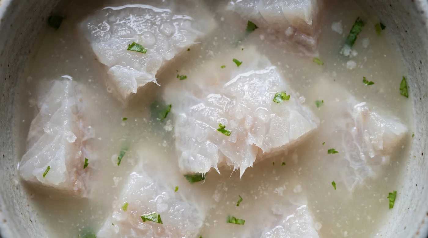 - Den korta badtiden: Häll marinaden över fisken. Rör försiktigt med en sked. Du noterar direkt hur ytan blir mjölkig medan kärnan förblir rå.