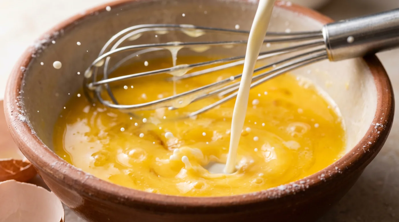 - Mät upp med precision: Knäck tre rumstempererade ägg i en rymlig skål. Tillsätt exakt en matsked iskall vispgrädde. Undvik salt i detta skede, då det drar ur fukt i förväg.