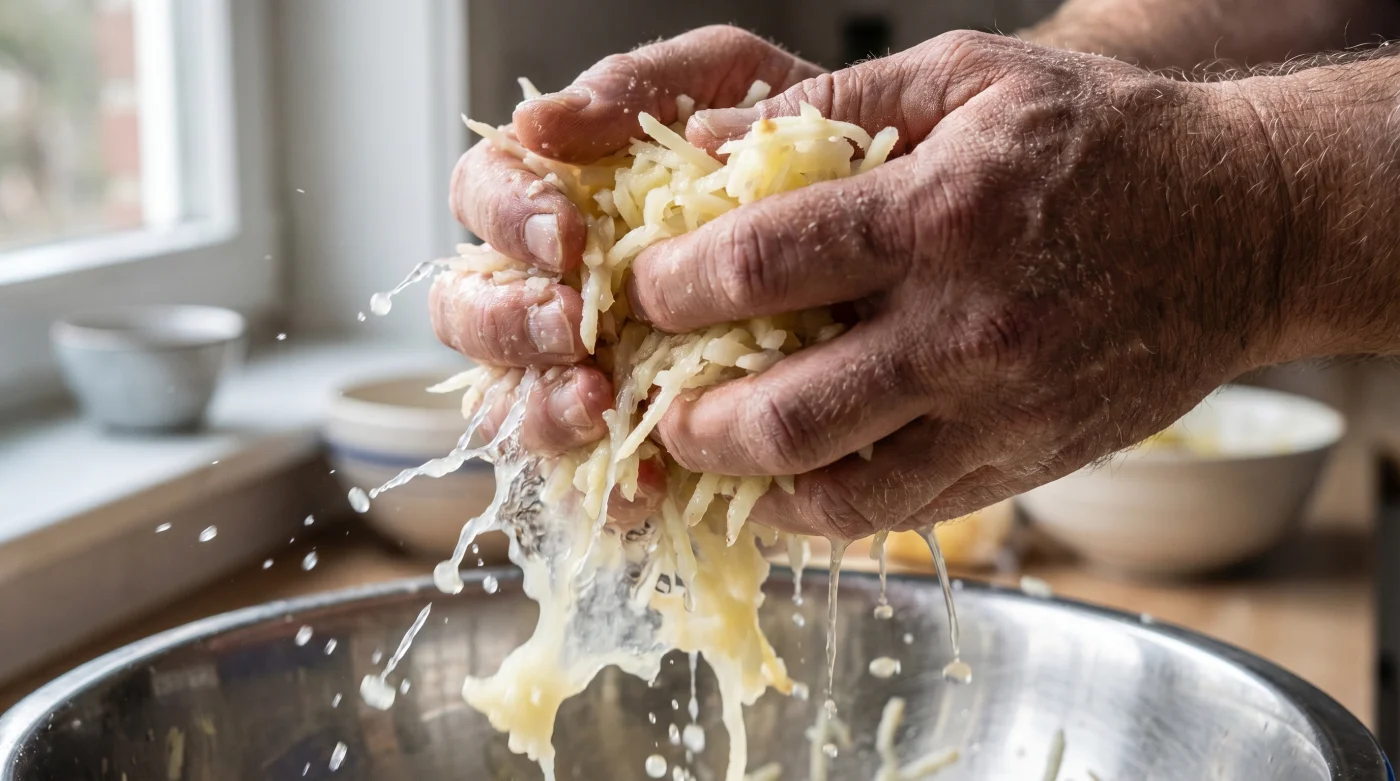 - Mekanisk hantering är kritisk. Riv potatisen grovt på ett rejält rivjärn. Lägg omedelbart rivet i en ren, luddfri kökshandduk och vrid ur tyget med all din kraft. Vattnet måste dräneras helt för att inte potatisen ska koka köttet inifrån under gräddningen.