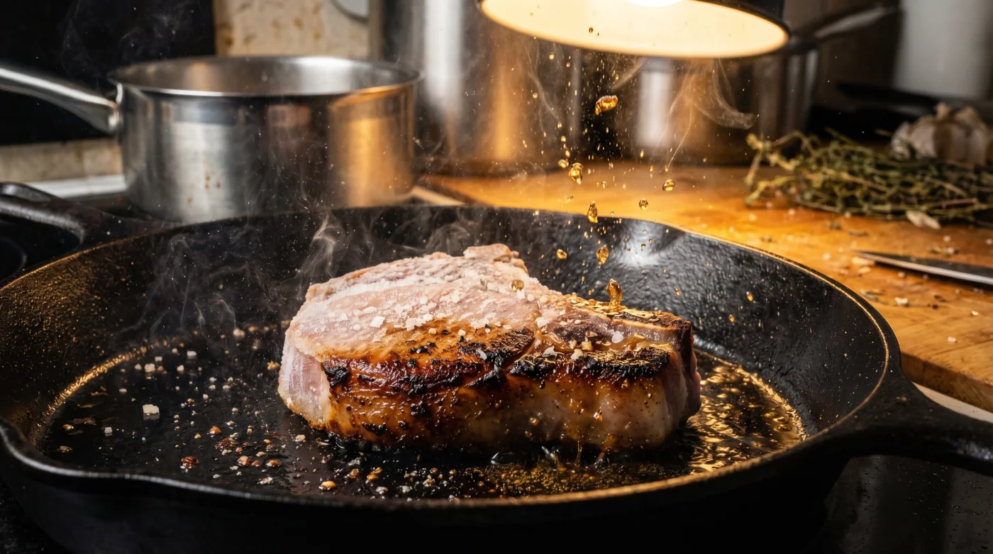 Tänk dig en glaciär som möter en eldkastare. Det är exakt den termodynamiken vi sätter i arbete här. Traditionella recept och tv-kockar insisterar rutinmässigt på att fläskkotletter måste vila på bänken i en timme. Men en rumstempererad kotlett, särskilt en som är tunnare än tre centimeter, har ett minimalt tidsfönster där den går från perfekt till grå skosula. När du steker från fryst tillstånd fungerar den kompakta iskärnan som en intern sköld mot överstekning. Hettan tvingas arbeta övertid på ytan för att skapa den karamellisering vi är ute efter, medan temperaturen bara långsamt och försiktigt sipprar in mot mitten av kotletten.Du får i praktiken en inbyggd sous-vide-effekt direkt i din hederliga gjutjärnspanna. Vattnet inuti köttets celler stannar kvar mycket längre eftersom temperaturökningen sker gradvis inifrån. Det handlar om simpel köttkemi. När proteintrådarna värms upp för snabbt drar de ihop sig och pressar ut all fukt i pannan. Genom att börja vid minus 18 grader Celsius förhindrar vi denna brutala sammandragning i köttets mest kritiska zoner.