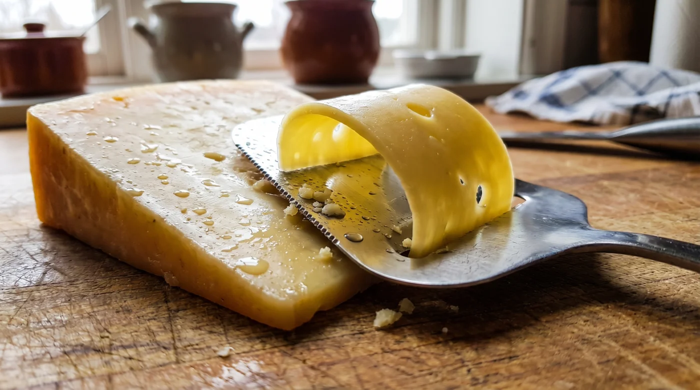 Om du är i akut tidsnöd vid frukosten: Skär bort den stela kanten rakt av med en bred kniv – den vanliga osthyveln kommer bara att glida eller hugga fast. Riv istället den hårda biten direkt på ett grovt järn, samla upp i en tät burk och spara som en kraftfull smakförstärkare till matlagning. Inget svinn behövs.