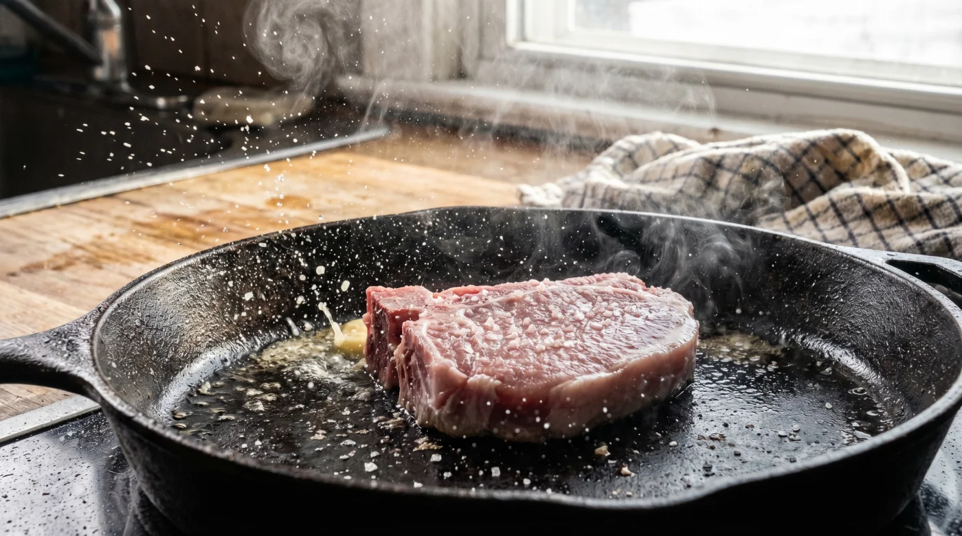 Det är ett ljud vi alla känner igen. Den tunga gjutjärnspannan ryker svagt, smöret fräser hysteriskt och tystnar sedan tvärt när köttet landar. Inom sekunder känner du doften av brända mjölkproteiner sprida sig i köket. Kanten på köttbiten drar ihop sig aggressivt, mitten buktar uppåt och tappar därmed helt kontakt med värmen. Du sänker febrilt temperaturen för att rädda situationen, men skadan är tyvärr redan skedd. Köttfibrerna har drabbats av en omedelbar termisk chock, dragit ihop sig som en knuten näve och börjat pressa ut all innesluten vätska. Det som från början skulle bli en saftig och välsmakande middag är nu en grå, stel sula som kämpar för sitt liv i en pöl av snabbt mörknande fett.
