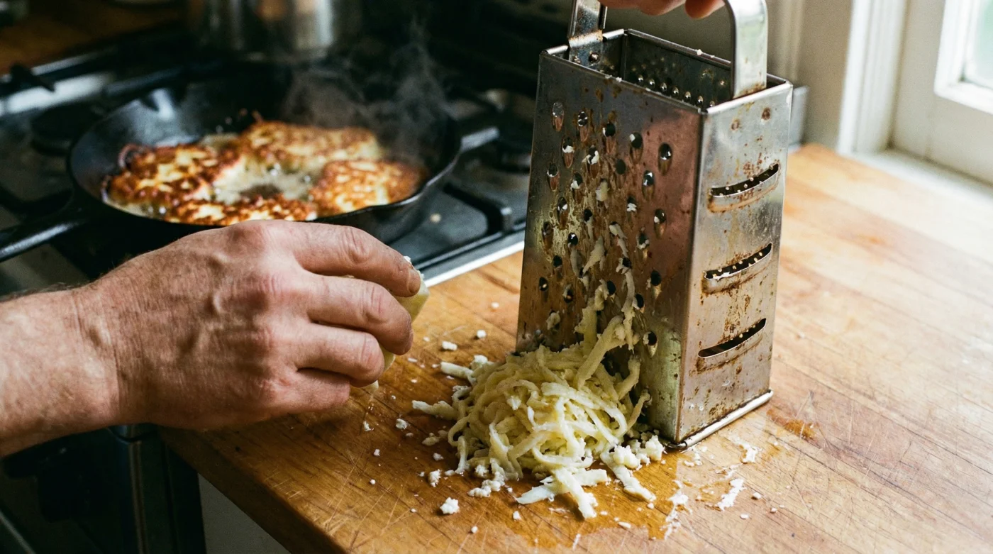 Genom att byta ut kniven mot ett grovt rivjärn innan tillagning skapar du ett oändligt nätverk av små trådar. Du bygger ett korallrev av ost. Denna till synes obetydliga handling maximerar ytan mot den heta pannan och tvingar fram en omedelbar karamellisering. Det handlar om att låta värmen tala direkt med saltet och mjölkproteinet, utan att ångan står i vägen.
