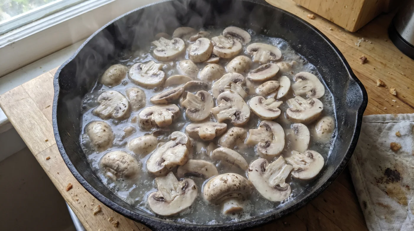 Att tänka på champinjoner är som att föreställa sig en folkmassa i en trång hiss en regnig dag. Utan ventilation stiger luftfuktigheten direkt, och alla blir bara varma och blöta. Champinjoner består till nittio procent av vatten, och när de möter värme drar deras cellväggar snabbt ihop sig och tvingar ut all fukt. Om du har packat pannan till bredden har denna vätska absolut ingenstans att ta vägen.