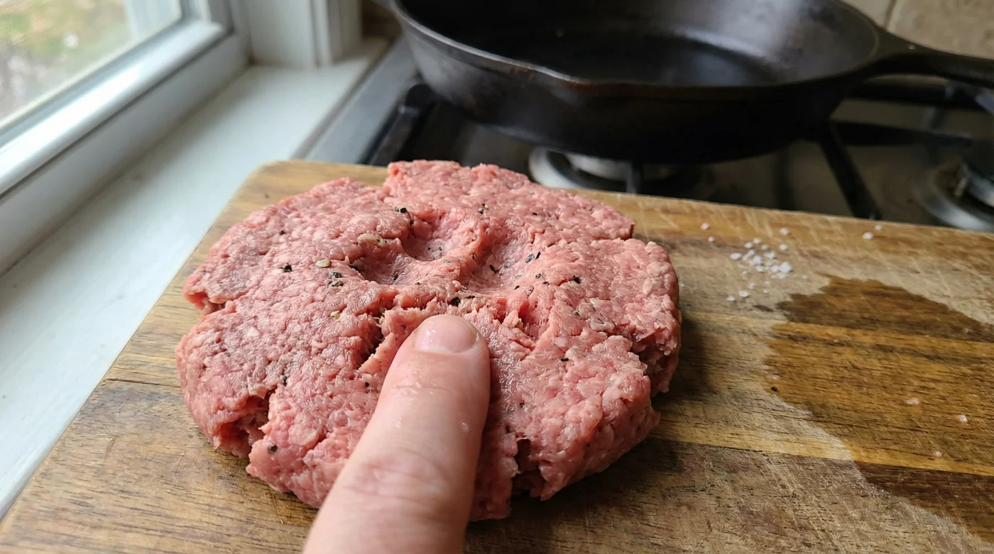 En ensam tumme gör skillnaden mellan en trött, uppsvälld köttbulle och en perfekt stekt pannbiff som respekterar sin egen form.