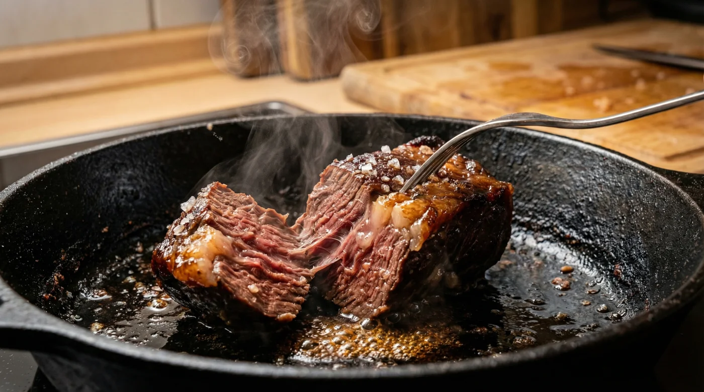 Ja, den initiala värmechocken är helt avgörande för magin. Om pannan bara är ljummen börjar köttet snabbt släppa ifrån sig vätska och kokar i sin egen saft, vilket totalt förstör både den krispiga stekytan och syrans nedbrytande effekt på fibrerna.Behöver jag låta köttet vila efter stekningen trots att det gått så snabbt?