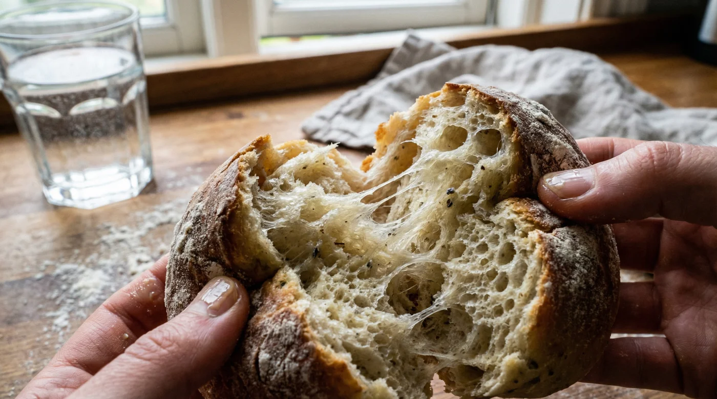 Att använda helt kallt kranvatten tvingar fram ett helt annat landskap. Kylan bromsar jästens framfart. Istället för ett hastigt uppvaknande får degen tid att bygga sin egen arkitektur. Under den långsamma jäsningen hinner mjölet suga åt sig all fukt i sin egen takt. Glutentrådarna växer sig långa, sega och oerhört starka. Dessutom frigörs syror och smaker i mjölet som aldrig får chansen att utvecklas när degen stressas fram i rumstemperatur.