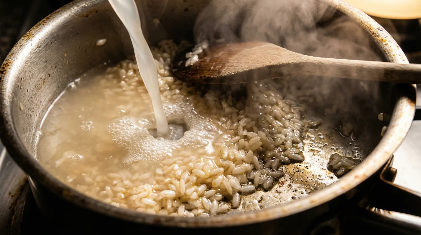 När du häller fyra grader kall vätska över risgryn som just värmts upp till över hundra grader, skapar du en våldsam temperaturkrasch. Risgrynet får en chock. Dess yttre porer, som precis börjat öppna sig för att släppa ut den åtråvärda stärkelsen, drar ihop sig och stängs som en mussla vid fara. Resultatet blir inte en sammetslen krämighet, utan separerade riskorn som simmar i en blaskig vätska.