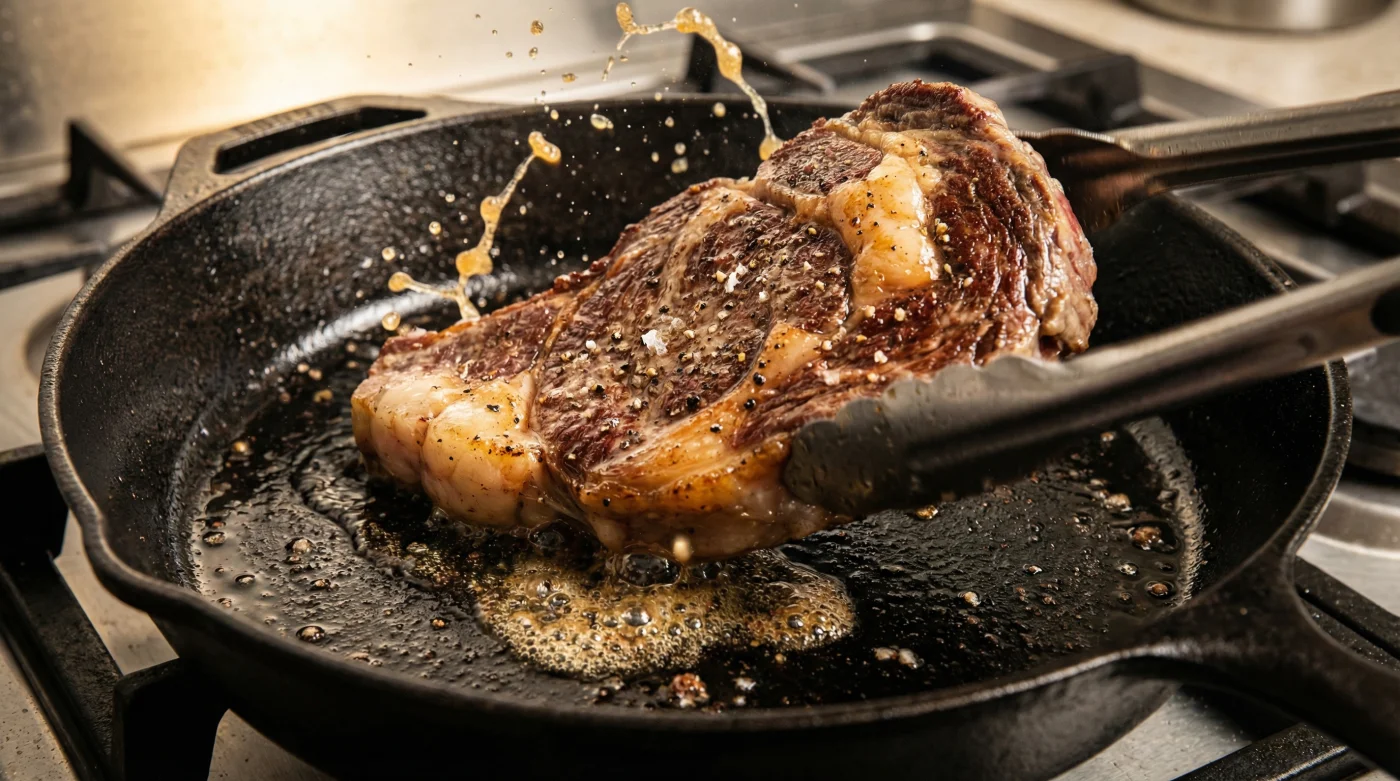 Du står där framför den rykande gjutjärnspannan. Doften av smältande nötfett och brynt smör fyller köket. Det sprakar aggressivt. Din hand kramar stekspaden, men du tvekar. En gammal röst ekar i bakhuvudet: ‘Vänd den bara en gång!’. Så du väntar. Du tittar på den råa ovansidan medan du känner paniken stiga över att botten håller på att förvandlas till kol. Det är en spänd väntan, fylld av oro för att förstöra en dyr och vacker bit färsk entrecôte. Men tänk om denna djupt rotade regel är precis det som står mellan dig och den där perfekta, krispiga ytan? Tänk om passivitet faktiskt är köttets värsta fiende i pannan?