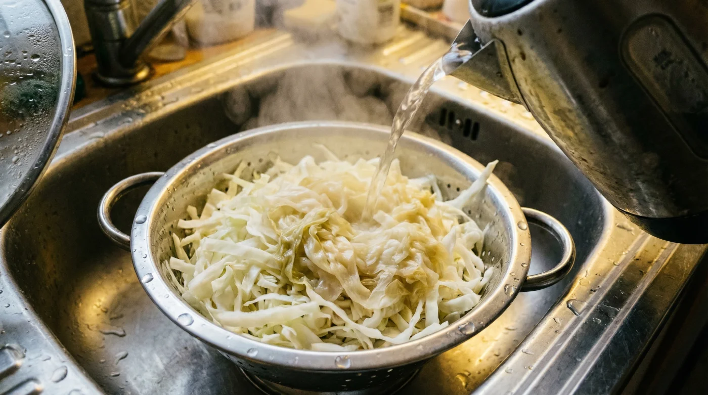 Koka upp rikligt med vatten. Du behöver minst en och en halv liter för ett normalstort, halvt kålhuvud. Lyssna efter det rullande, arga koket i kastrullen eller vattenkokaren; vattnet måste tveklöst nå exakt hundra grader Celsius för att processen ska fungera. Häll därefter det stormkokande vattnet i en lugn, jämn rörelse över hela kålberget. Du kommer omedelbart att bevittna en förändring. Berget sjunker ihop framför dina ögon, tappar sin envisa volym och antar en mjukare, nästan glasig yta medan ångan stiger varm och fuktig mot ditt ansikte.