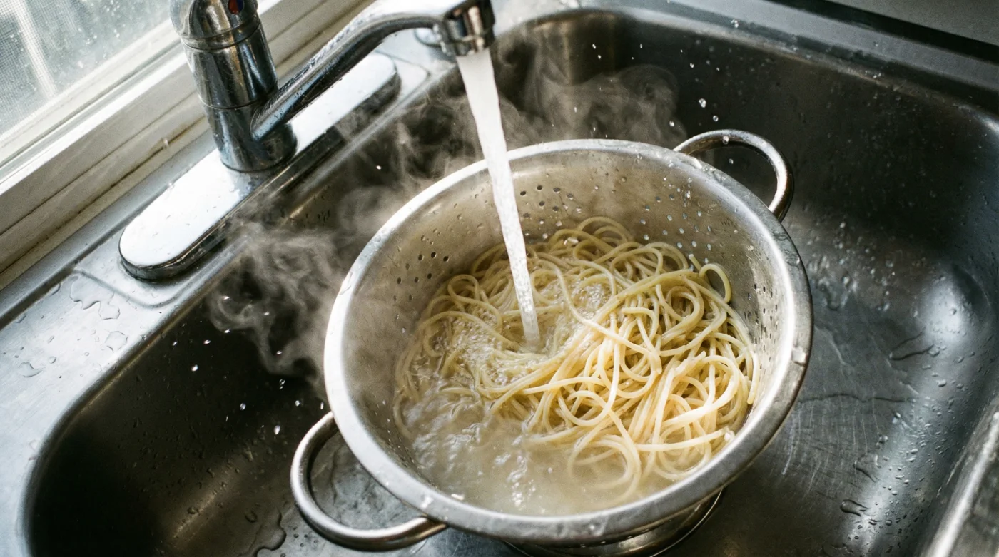 Ångan stiger i tunga moln mot köksfläkten. Vattnet stormkokar, en rytmisk puls av bubblor som slår mot kastrullens kanter. Du kastar ett öga på klockan, griper handtagen och skyndar mot diskhon. Durkslaget väntar. Sedan gör du det som så många av oss fått lära oss sedan barndomen: du vrider på kallvattenkranen och låter en isande stråle skölja över den nykokta pastan. Syftet? Att stoppa kokprocessen. Men i samma ögonblick som det kalla vattnet träffar de varma trådarna, spolar du bokstavligen bort måltidens hela potential ner i avloppet. Kvar på tallriken hamnar en sorglig syn: naken, halkig pasta och en tomatsås som samlas i en vattnig pöl på botten.