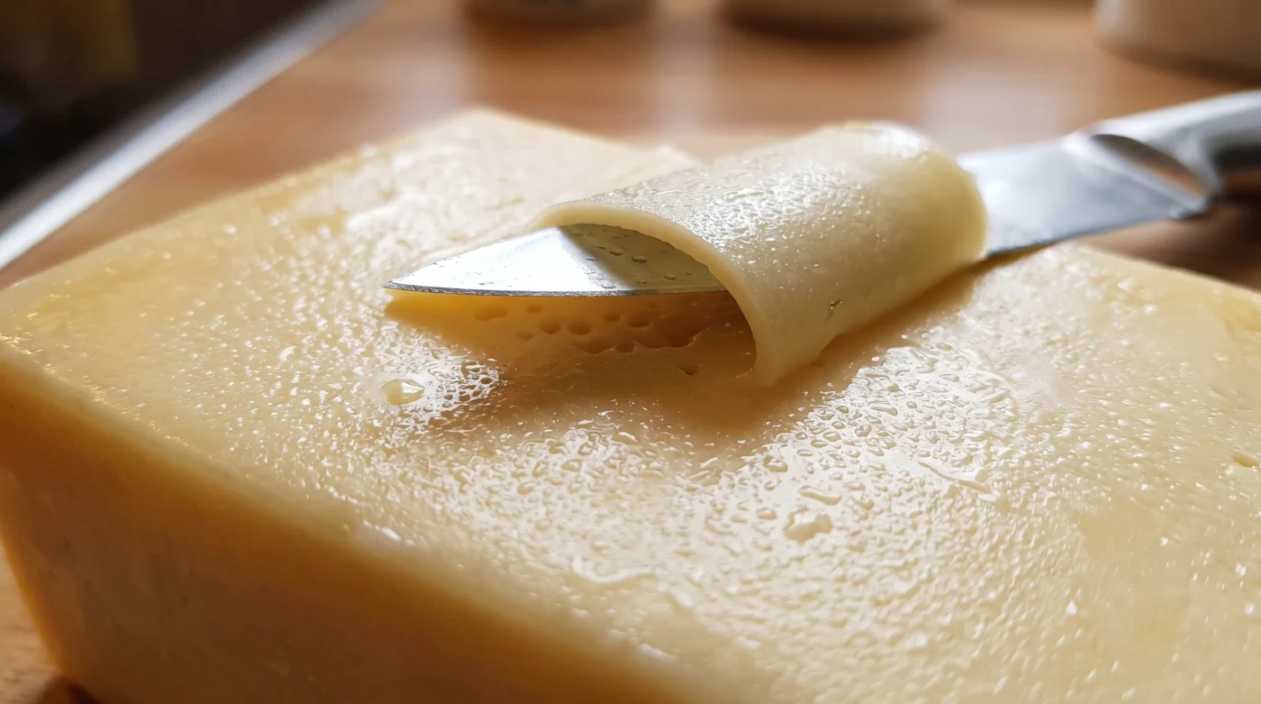 Den absolut mest tålamodsprövande frustrationen med denna korttidslagrade version är rent mekanisk: osten trasar sönder och fastnar i hyveln. Det mjuka, ofärdiga kaseinet rullar ihop sig till sorgliga och klibbiga strängar på bladet. Om detta inträffar, avbryt omedelbart. Felet beror på att ostens inre vattenhalt är för hög i förhållande till metallverktygets friktion. Byt till en bredbladig kniv och skär tjockare stavar, eller låt blocket lufttorka helt utan papper i cirka trettio minuter. Det skapar en tunn hinna som gör att hyveln får fäste.