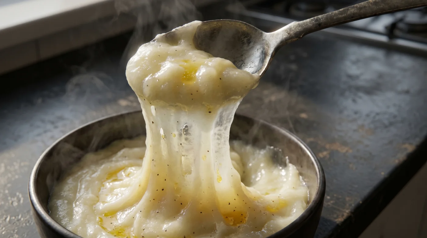 De snabba metallvisparna har precis slitit sönder potatisens cellväggar och tvingat ut massiva mängder stärkelse i fel ögonblick. Fysiken är helt skoningslös: hög friktion kombinerat med koncentrerad potatisstärkelse skapar snabbt ett oätligt klister, oavsett hur mycket smör du frenetiskt rör ner för att försöka rädda situationen.