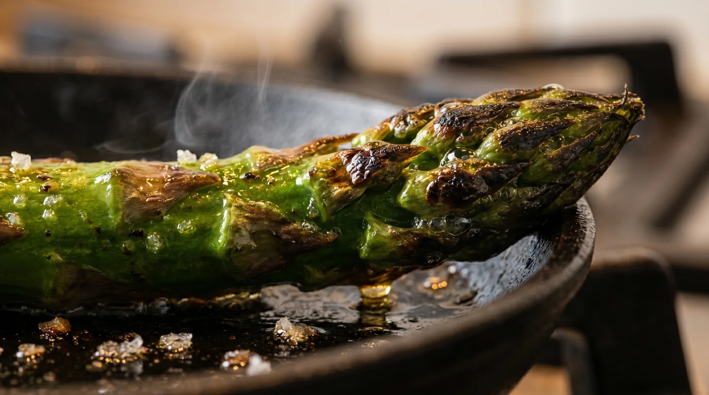 Genom torr-svedning utnyttjar du istället sparrisens egen vätska. Den heta metallen förångar snabbt ytfukten och skapar ett massivt övertryck inuti stjälken. Grönsaken tillagas alltså i sin egen interna ånga, utan att förlora vare sig sin spänstiga struktur eller sin koncentrerade, gräsiga smakprofil. Resultatet är ett krispigt yttre skal och en mjuk, klorofyllfylld kärna som fortfarande har tuggmotstånd.