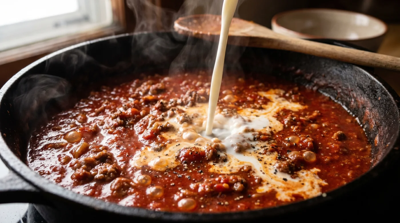 Det doftar av stekt lök och karamelliserat nötprotein. Krossade tomater fräser aggressivt när de träffar det heta gjutjärnet, och den skarpa, metalliska syran river lätt i näsan. Det är precis i det här skedet de flesta häller i mer buljong, sänker värmen och hoppas på det bästa. Men när en deciliter iskall mjölk plötsligt slår ner i den puttrande röda kratern händer något. Fräsandet tystnar till ett dovt bubblande. Den djupröda färgen bleknar omedelbart till en mjuk, nästan dammig terrakotta. Köttfibrerna börjar direkt att slappna av och smälta samman med vätskan. Det handlar inte om att späda ut smaken. Det är ren kemi som tvingar råvarorna att sluta slåss mot varandra.