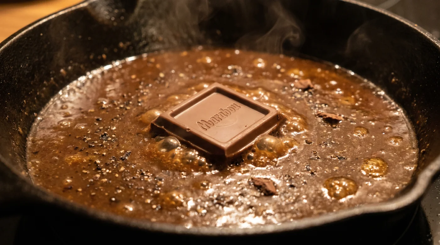 De kemiska föreningarna i chokladen binder sig rent fysiskt till de brända proteinerna från steken och mjölet. Denna inkapsling isolerar den fräna smaken innan den ens hinner nå dina smaklökar. Kakaosmöret rundar av den vassa, metalliska kanten från det brända, medan mjölkpulvret och den milda sötman återställer såsens grundläggande smakbalans utan att ta över.