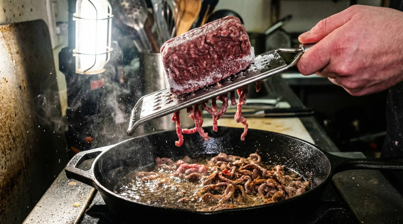Vi har i generationer fått lära oss samma gamla regel: kött måste alltid vara rumstempererat innan det nuddar värmen. Att medvetet lägga något isande fryst rakt ner i stekpannan har ansetts vara ett odiskutabelt regelbrott. Men sanningen är att nötfärs inte är, och beter sig inte som, en massiv oxfilé. När du låter ett block fryst köttfärs ligga och tina på diskbänken, eller tvingar fram processen i mikrovågsugnen, bryts cellväggarna ofrånkomligen ner. Vätskan inuti separerar från proteinerna. Resultatet blir att köttet kvävs av fukt så fort det träffar pannan.