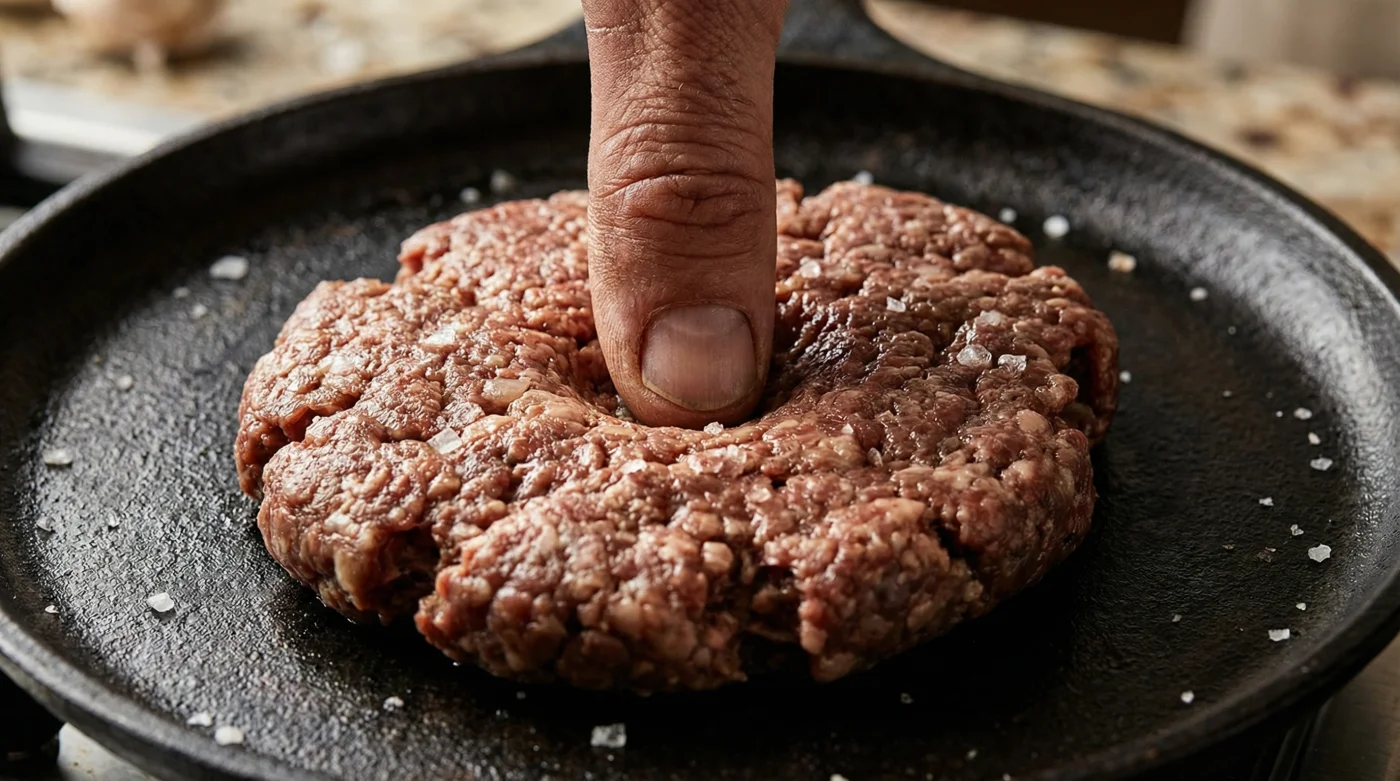 Tryck därefter försiktigt ner tummen i mitten av köttet. Du ska inte trycka ett hål hela vägen igenom. Målet är att skapa en mjuk, grund skål, ungefär en centimeter djup och två till tre centimeter i diameter. Denna lilla krater ser kanske oansenlig ut när biffen ligger rå på brädan, men dess fysiska funktion är helt avgörande.