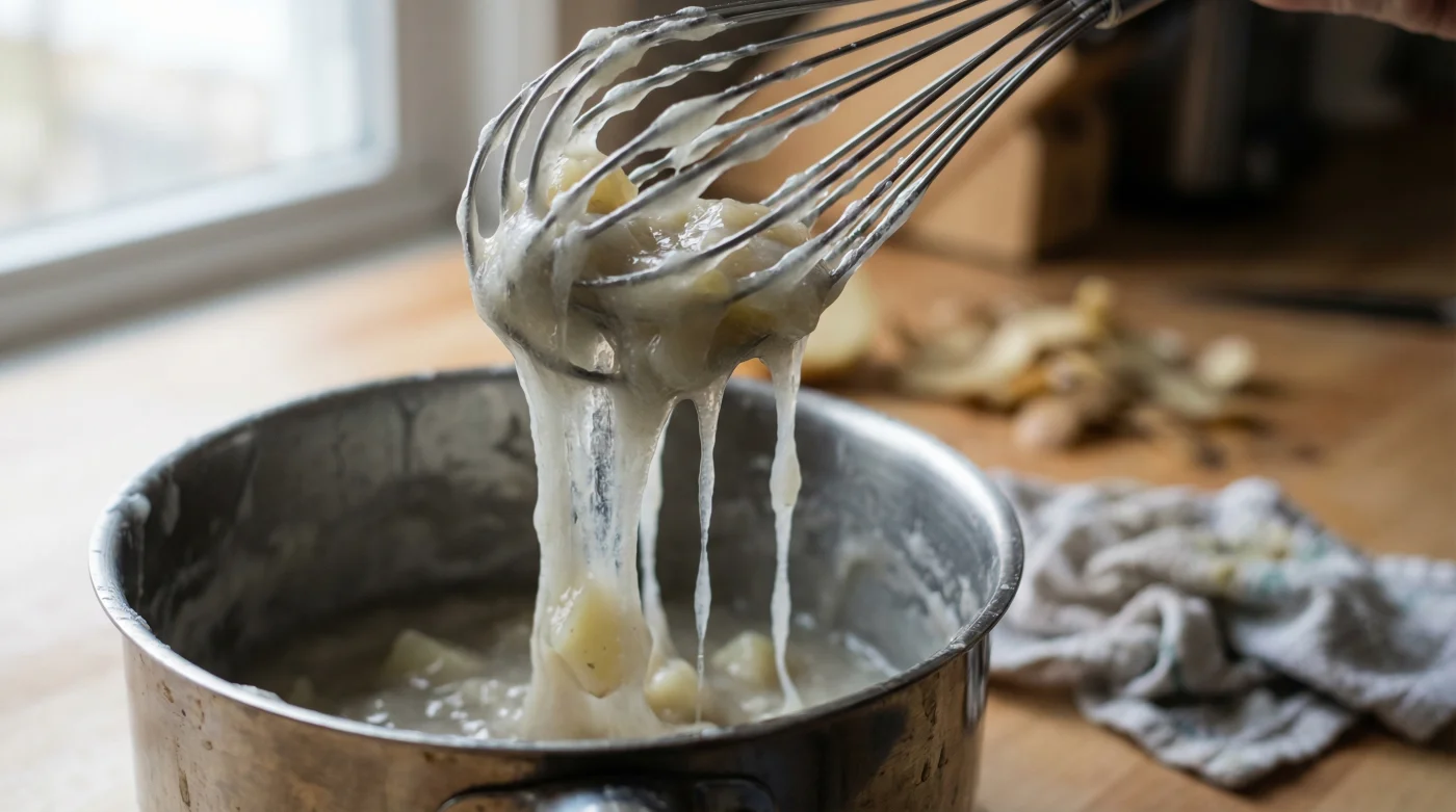 Tänk dig den råa potatisen som en tätt packad, kall fästning av stärkelse och vatten. När du kastar ner den i hundragradigt vatten, skapas en omedelbar och våldsam reaktion på ytan. Den yttre delen av potatisen kokar sönder på några minuter och släpper ut all sin stärkelse i vattnet. Samtidigt förblir kärnan stenhård och rå. När du sedan försöker mosa detta ojämnt tillagade resultat, där vissa delar är okokta och andra sönderfallna, binder den frigjorda, överkokta stärkelsen samman allting till ett aggressivt klister. Du har inte mosat potatisen; du har tvingat fram ett industriellt bindemedel.