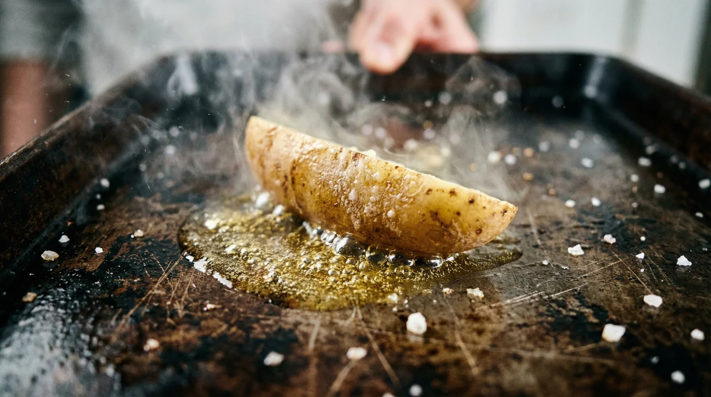 När ugnen är varm, använd kraftiga grytlappar och ta ut den heta plåten. Placera den säkert på spisen. Ringla nu över en olja som tål höga temperaturer. En vanlig svensk rapsolja för fyrtio kronor litern är alldeles utmärkt här; den har en hög rökpunkt och en neutral smakprofil som låter potatisen tala. Oljan kommer att skimra omedelbart när den möter metallen.
