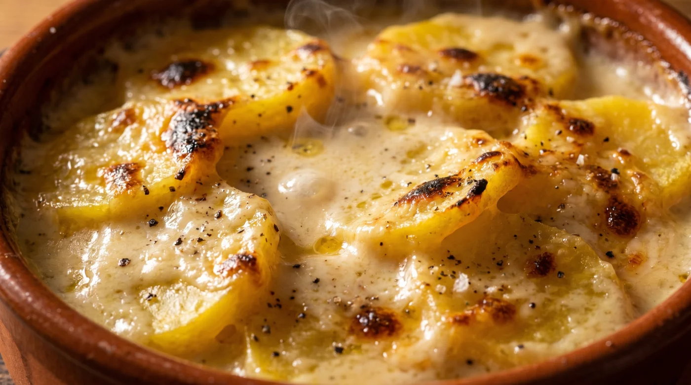 Skrapet av en träslev mot en emaljerad gjutjärnsgryta låter tyngre än vanligt. Ljudet när potatisskivorna vänds i en vit sås som vägrar bete sig som den brukar signalerar att något i grunden har förändrats. Det doftar rostad vitlök, jordig stärkelse och varmt smör, men det är den rent fysiska konsistensen som får dig att stanna upp vid spisen. Istället för den tunna, blaskiga mjölkfilm som annars rinner av potatisen direkt, ligger en tjock, glansig beläggning stadigt kvar på sleven. Värmen i ugnen ligger stadigt på 200 grader Celsius, och när formen dras ut hörs inte det tunna, ilskna fräsandet av bränd mjölk mot kanterna. Istället möts du av ett dovt, trögt puttrande. Du betraktar en perfekt stabil emulsion som bryter mot allt du lärt dig.
