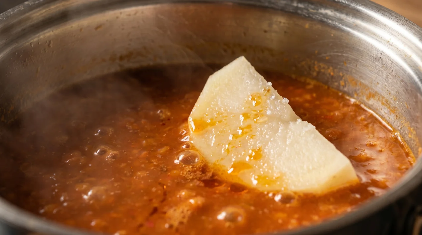 Det du behöver är en biologisk svamp som lyssnar och absorberar. En rå potatis fungerar just så. När du lägger i stora, skalade bitar av potatis i den varma buljongen påbörjas en stilla kemisk process. Stärkelsen i potatisen sväller och drar åt sig den salta vätskan. Den dricker upp överflödet utan att stjäla soppans själ.