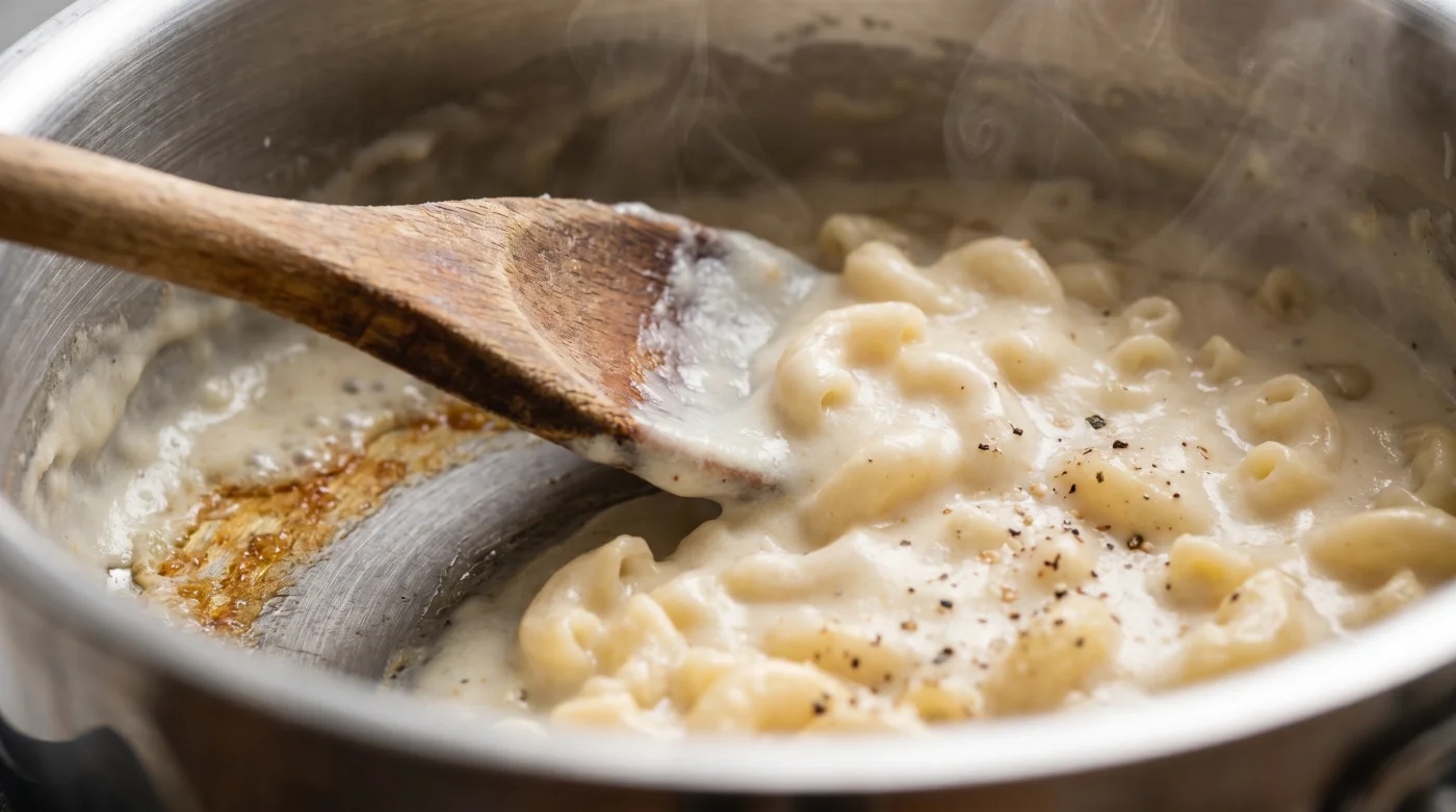 Om du däremot låter mjölken nå en temperatur där den nästan darrar av värme innan du försiktigt tillsätter pastan, sker något radikalt annorlunda. Den heta vätskan aktiverar omedelbart makaronernas stärkelse. Det bildas direkt en skyddande, gelliknande yta runt varje enskild makaron. Denna process ger pastan en omedelbar flytkraft, ungefär som när saltvatten lyfter en tung kropp. Makaronerna börjar sväva i vätskan i stället för att sjunka ner och klamra sig fast vid värmekällan.