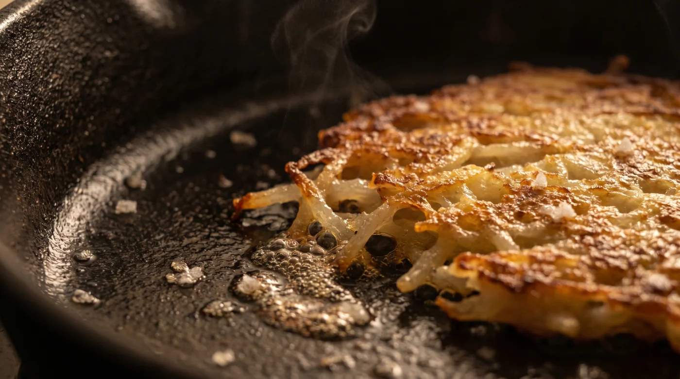 - Tålamod: Rör inte raggmunken överhuvudtaget förrän du tydligt ser att de yttre kanterna har blivit mörkt gyllene och frasiga, vilket oftast brukar ta exakt tre minuter.
