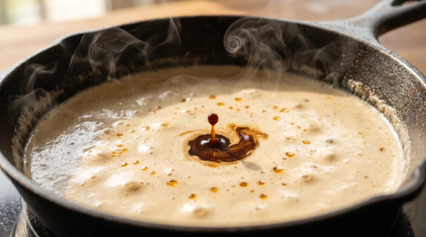 Stekpannan av gjutjärn står kvar på spisen och knäpper tyst när värmen långsamt sjunker. Du har precis lyft över steken till skärbrädan där den får vila, och kvar i pannan finns den mörka, doftande stekskyn. Det är dags för finalen. Du sänker värmen, rör ner en generös skvätt vispgrädde och låter träsleven skrapa botten för att lösa upp alla karamelliserade smaker. Såsen börjar puttra, grädden ska darra lätt i kanterna, och du förväntar dig att se den där djupa, varma färgen träda fram.
