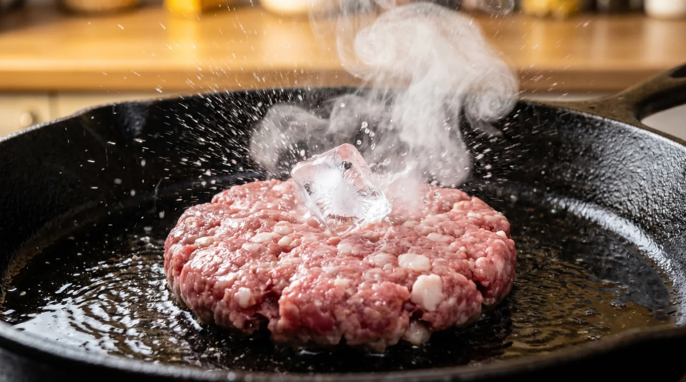 Lösningen ligger i att balansera temperaturen inifrån, att ge köttet en chans att stabilisera sig innan värmen chockar kärnan. Genom att gömma en enda liten isbit i mitten av köttpucken skapar du en fördröjd och skonsam smältprocess. Medan pannans intensiva hetta bryner utsidan till en perfekt krispig yta, håller isbiten den inre kärnan sval. Fibrerna hinner sätta sig i sin ursprungliga form utan att panikartat dra ihop sig, och när isen väl smälter ångar vattnet långsamt upp genom köttet och adderar fukt.