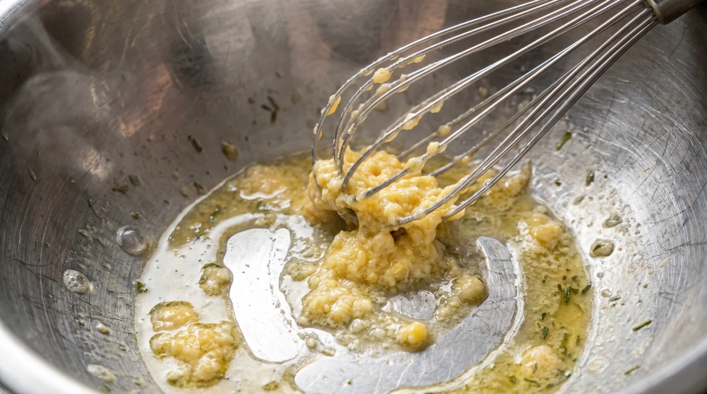 Här ligger kärnan till varför din ansträngning misslyckas. När det smälta smöret överstiger sextio grader förändras spelreglerna drastiskt. Det brännheta fettet tillagar äggulans proteiner på en mikroskopisk nivå samma sekund som dropparna träffar blandningen. I stället för att mjukt omsluta fettet och skapa en emulsion, stelnar proteinerna. De knyter sig och vägrar binda.