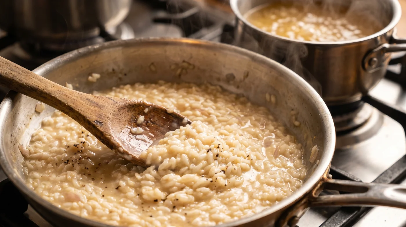 Att koka klassisk risotto är en övning i närvaro. Du behöver inte stressa utan enbart lyssna till hur vätskan beter sig när den träffar kastrullens varma botten. Det bör alltid höras ett lågt, dämpat väsande, absolut ingen total tystnad. Tystnad betyder att värmen har dött och att riset har slutat avge stärkelse.