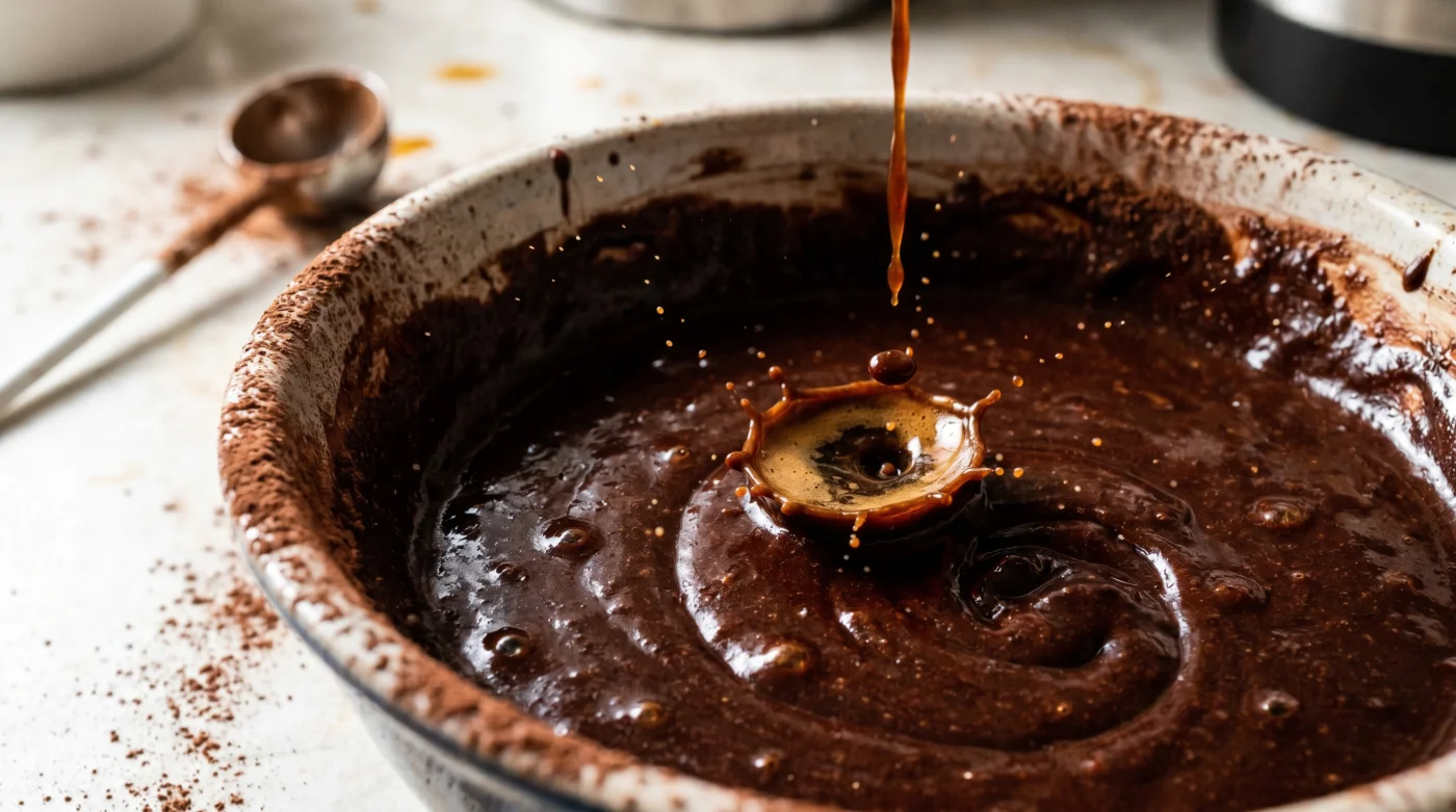 För dig som ständigt väger ingredienserna på grammet och vägrar kompromissa. Använd två matskedar kall espresso av hög kvalitet. Espresson ska helst ha vilat i kylskåp över natten. Kylan gör att bitterämnena mjuknar och skapar en rundare, mörkare fond åt kakaon utan att störa smetens temperatur.